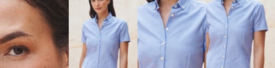 Women's modern fitted, button-down Oxford shirt. Cotton-rich lightweight Oxford with wrinkle resistant finish. Short point collar. Pearlised buttons.