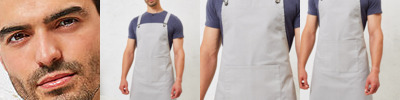 Self-fabric ties that are fastened to the main body of the apron with dungaree style buckles. The straps then hook over the shoulders, cross over at the back, loop through the large eyelets at the waist and tie neatly at the back. Also features a useful front centre pocket with combined pen slot. This style is designed to be paired with our PR119 Interchangeable apron straps should you want a contrast colour or fabric to the main body of the apron.