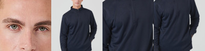 Contrast upper chest and underarm panels. Quarter zip. Side panels. Reverse nylon zips centre front and side pockets. 1x1 ribbed cuff sleeve. Semi-automatic zip pull and slider.