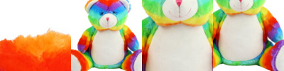 Multi-coloured soft plush bear. Contrast sewn nose and eyes. Cream coloured panel on tummy and feet. Zip access on the base of the bear for direct access onto the tummy for embroidery. Removable inner stuffing. Can be embroidered or sublimation printed. Complies with EN71 European Toy Safety regulations. Remove all hang tags and their fasteners before giving these items to a child. Suitable for children of all ages.