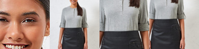 Pleat front blouse. Single button back neck opening. Set-in long sleeve. Slightly gathered sleeve at cuff with keyhole opening and button fastening. Slightly curved hem. Fabric contains easy care, wicking, anti UV, quick-drying properties.