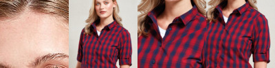 A women's long sleeve semi-fitted shirt with multi-coloured contrast check pattern. Single button cuff and sleeve guard which is designed to be rolled up and secured in place with a button and tab on the upper arm. Soft collar styling with curved hem.