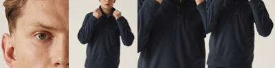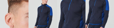 ¼ zip style with stand-up collar. Contrast colour/fabric panels at sides and sleeves. Reversed nylon coil zip with lock down zip slider. Contrast colour stretch binding at cuffs and hem, and concealed pocket in panel seam (right-hand-side as worn). Finden & Hales tear-out label for easy rebranding.