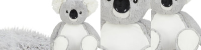 Soft plush Zippie koala bear with contrast nose and inner ears. Sewn eyes and mouth. White panel on tummy, perfect for decoration. Zip access on base for direct access onto the tummy for decoration. Removable inner stuffing. Can be embroidered, vinyl, and sublimation printed. Complies with EN71 European Toy Safety regulations. Remove all hang tags and their fasteners before giving this item to a child. Suitable for all ages.