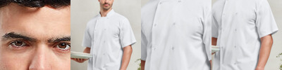 Ideal for laundry. No buttons to fall away. Soft hand feel. Specifically engineered for user comfort. Mandarin Collar stand with topstitching. Press studs. Unisex styling. 60 degree domestic wash.
