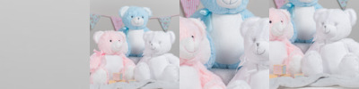 Soft plush bear. Contrast cream nose, front panel, and paws. Sewn nose and eyes. Matching ribbon and bow. Zip access on the base of the bear for direct access onto the tummy for decoration. Removable inner stuffing. Can be embroidered or sublimation printed. Complies with EN71 European Toy Safety regulations. Remove all hang tags and their fasteners before giving these items to a child. Suitable for children of all ages.