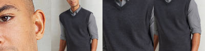 Cotton rich with a fine 12 gauge knit. Sleeveless with ribbed detail on the arm holes, v-neckline and hem.