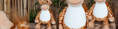 Soft plush zippie giraffe. Contrast hooves, nose, and horns. Sewn eyes and mouth. Contrast mane and the tail. White panel on tummy is perfect for decoration. Zip access on base for direct access onto the tummy for decoration. Removable inner stuffing. Can be embroidered, printed and sublimation printed. Complies with EN71 European Toy Safety regulations. Remove all hang tags and their fasteners before giving these items to a child. Suitable for all ages.