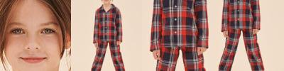 Woven tartan lounge set with plain hem. Shirt with a pyjama collar and pearlised button front, and bottoms with a full elasticated waist. Tear-out label.