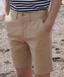 Flat front chino short. Tag free. Stretch fabric for ease of movement. Slanted front pockets. 2 x back welt pockets. Belt loops. Plain hem.