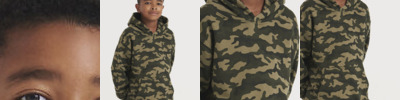 Classic all-over camouflage print design. Double fabric hood. Twin-needle stitching detail. Kangaroo pouch pocket. No drawcords - to comply with EU regulations. Brushed inner fleece. Ribbed cuffs and hem. Soft-cotton faced fabric creates ideal printing surface. Simple tear-out label makes it perfect for rebranding.