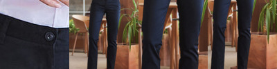Flat front, straight leg, slim fit. 2 back pockets with button. Dyed to match buttons. Front side pockets. Dyed to match pocket bags. Belt loops.