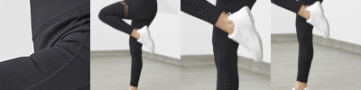 Opaque, stretch fabric. Deep waistband with inner pocket. Squat-proof. Fine mesh panels on front and back thigh. Laser cut panels at lower calves, front and back. Tombo tear-out label.
