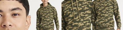 Twin-needle stitching detail. Classic all over camo print. Flat lace drawcords. Double fabric hood. Kangaroo pouch pocket. Ribbed cuffs and hem. Soft cotton faced fabric creates ideal printing surface. Simple tear-out label makes it perfect for rebranding. Flat lace drawcords. Brushed inner fleece.