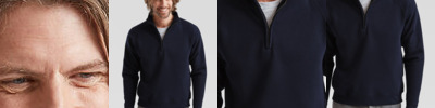 35% sustainable cotton and 65% polyester brushed back fabric. Ribbed cuffs and hem. Half-zip.