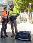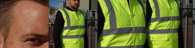 PU coated polyester. Polyester lining. Conforms to EN ISO 20471: 2013 + A1: 2016 class 2, EN343: class 3:1. Black ribbed knit collar. Full length zip. Reversible. Outside has two reflective bands around the body and one over each shoulder. Two front pockets with flaps on hi-vis side. Two front pockets on navy reverse. Branding on lower right pocket flap.