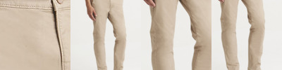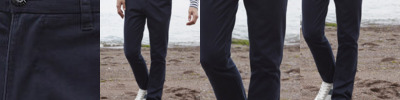 Flat front chino trouser. Tag free. Stretch fabric for ease of movement. Slanted front pockets, 2 back welt pockets, belt loops plain hem.