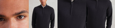 ¼ zip through collar fastening. Cotton rich yarn for a soft feel. Fine gauge knit. Set in sleeve with a ribbed knit cuffs and ribbed hem for fitted styling.