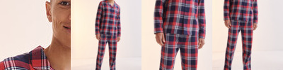 Woven tartan lounge set with plain hem. Shirt with a pyjama collar and pearlised button front, and bottoms with a full elasticated waist. Tear-out label.