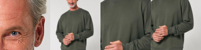 Set-in sleeve. 1x1 rib at neck collar, sleeve hem and bottom hem. Inside herringbone back neck tape. Self-fabric half-moon at back neck. Single-needle topstitch at neck collar. Armhole, sleeve hem and bottom hem with twin-needle topstitch. Unisex, medium fit, long sleeve, round-neck. 85% organic ringspun combed cotton, 15% recycled polyester. Brushed sweatshirt. Fabric washed, light sueded. Vegan certified. Fairwear Foundation certified. Oeko-Tex certified.