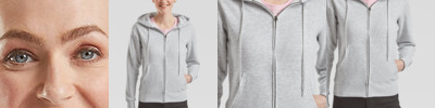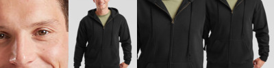 Double fabric hood. Self-coloured flat draw cord. Single jersey back neck tape. Covered zip for enhanced printability. Two front pouch pockets. Waist and cuff in cotton/elastane rib.