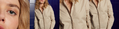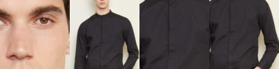60% organic cotton/40% recycled polyester. Mandarin collar. Concealed self colour button placket. Back yoke. Two button adjustable cuffs with button on cuff gauntlet. Curved hem. Unbranded size label.
