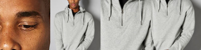 100% cotton-faced fabric. Self-coloured Jersey-lined hood. Self-coloured woven tape to back neck and back of zip for comfort. Taped shoulders. Full-needle double-layered cuff and welt with twin-needle stitching. Double-stitched armholes and shoulders. Kangaroo pocket. YKK metal central 1/4 zip with matching metal eyelets. Flat, self-coloured cord with metal ends. Tear-out back neck label for easy rebranding.
