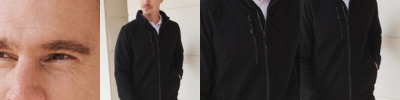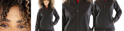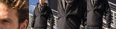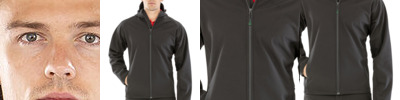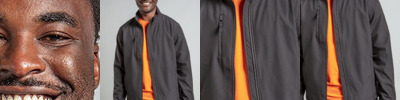 Standard fit. Full-zip front. Zipped chest and side pockets. Printable three-layer binded softshell fabric. Chinguard. Internal storm flap. Adjustable shock cord hem. Windproof and showerproof.