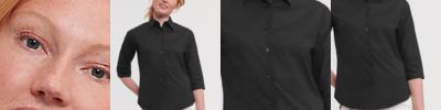 Stretch fabric for added comfort and fit. Requires minimal care, darts on back panel and on front from bottom hem to bust, for fitted ladies' shape. 7 button placket with matching colour buttons. Classic single button collar, elbow-length sleeve with split cuff.