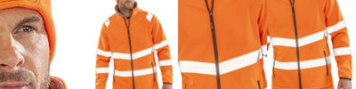 Showerproof. Breathable. Windproof. Elastane-free, crimped yarn stretch, easy to print. Zip-through collar with chin guard and zip pull. 50mm sewn-on reflective safety bands. Microfleece-lined for extra warmth. Black elasticised bound cuff. Decorative top stitch. Zipped pockets. Hang loop. Lowest commercial price for a safety softshell. Recycled fabrics comprising 100% recycled polyester outer and 100% polyester microfleece backing. UKCA, EN ISO 20471: 2013+A1:2016 Class 2, RIS-3279-TOM Issue 2: Class 2 (orange).