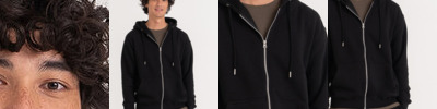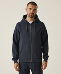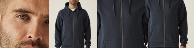 Long sleeve regenerated cotton zoodie with brushed inner and peached outer face. Features include set-in sleeves, contrast rib at cuffs hem, full length front zip and kangaroo pocket.