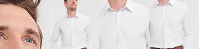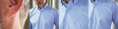 60% cotton/40% polyester. Easy iron fabric. Tailored fit. Button down collar. French placket with clear pearlised buttons. Back yoke. Two button adjustable cuffs. Curved hem.
