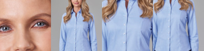 60% cotton/40% polyester. Easy iron fabric. Tailored fit with princess seams. Soft semi-cut away collar. French placket with clear pearlised buttons. Back yoke. Two button adjustable cuffs. Curved hem.