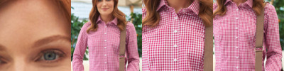 60% cotton/40% polyester. Easy iron fabric with peached finish. Tailored fit with princess seams. Soft semi-cut away collar. Clear buttons. Back yoke. Two button adjustable cuffs. Curved hem.