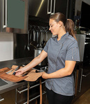 Suitable for 60°C wash and tumble dry. SpotShieldTM stain resistant coating for fabric protection. Double layer fabric on shoulder for added durability. Locker patch for internal identification. Flat knit collar on placket. Plastic-coated metal buttons, ideal for use in the food industry. Drop tail for a comfortable working fit.