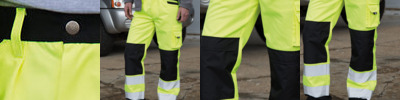 Partially elasticised waistband with belt loops. Front zip with button fastening. High rear comfort waistband. Rear patch and ruler pockets. Front slit and zip pockets. Black contrast panels. Bar tack stress points. Reflective Hi-Viz leg bands. Side cargo pocket. Kneepad pockets. Hammer loop. Generous fit. Ready to band cut away label. Tough and hardwearing with mechanical stretch. EN ISO20471:2013 CLASS 2. RIS-3279-TOM CLASS 2: Issue 2:2019 (orange only). Decorating methods: Embroidery. Decorators access point: Inside left chest and back hidden zips