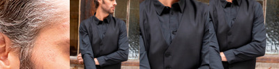 100% cotton micro twill. Non-iron fabric. Classic collar. Self colour buttons. Back yoke. Bust and back darts. Two button adjustable cuffs with button on cuff gauntlet. Curved hem. Unbranded size label.