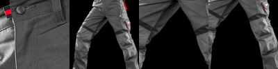 Front zip with rivet fastening. Knee pad pockets. 2 side pockets. Left thigh phone pocket and zip pocket. Cargo multi-use tool pocket. Elasticised waistband. Rear pockets. Belt loops. Reinforced seams with bar tacked pockets and stress points. Triple stitched seams. Decorative reflective stripe. Strengthened contrast knee fabric. Tricot waistband for comfort feel inner. Comfort fit. Highly durable fabric. Expansion waistband allows for adjustable fit and draught protection. Highly technical. Fantastic price point. Black contrast panels and red stitch detailing. 2 trouser turn-up for lengthening if required. Unisex fit. Windproof.