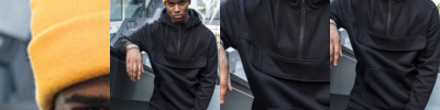Inside brushed sweat fabric, hood and hem with drawstrings, ribbed cuffs at sleeve openings, kangaroo pocket.