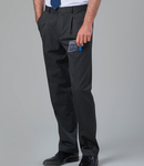 65% polyester/35% viscose. In transition to using recycled polyester. Classic fit. Single pleat. Waistease function. Belt loops. Zip fly with button over. Two side pockets. Rear pocket. Machine washable.