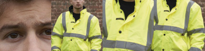Fully waterproof & windproof security jacket with the enhanced visibility for safety. PU coated Nylon outer fabric with 190g quilted padding and Nylon lining. Heavy duty zip with studded storm flap. 2 outer pockets with over flaps. Elasticated Knitted storm cuffs in the sleeve ends. Step collar with a concealed integral hood. Inside breast pocket. Throughout stitched and taped seams to ensure waterproof. Matching trousers available, code HVS461.