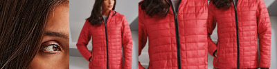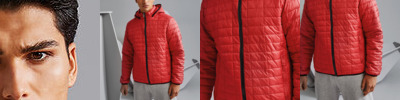 Fitted padded jacket. Honeycomb pattern with horizontal and vertical stitching. Piped edging. Zip fastening and two covered zip side pockets. Underside is lined with an open trim pocket useful for carrying mobile devices. Access point to inner jacket for easy embellishment. Elasticated cuffs and hem. High neck collar stand with attached hood. Product contains no branded neck label.* Removable Kimble or looped garment tags. Inner seam label holds important product information on one label with a second label containing brand information which can be cut-away.