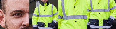 300D polyester. Quilted lining. Conforms to EN ISO 20471: 2013 + A1: 2016 class 3, EN343: class 3:1. Waterproof with taped seams. Fleece lined inner collar. Concealed adjustable hood. Full length two way zip with studded storm flap. Two reflective bands around the body, sleeves and one over each shoulder. Chest pocket. Two front pockets. Inner pocket. Concealed knitted storm cuffs.