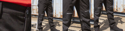 Removable multi-use front pocket system including. ID pass pocket. Contrast stitch bar tack stress points. Bellowed cargo and rear pockets. Front zip with rivet fastening. Reflective back leg strip. Belt and hammer loops. Cordura® ankle hem. Knee pad pockets. Belt loops. D-rings. Co-ordinated X-OVER range. Generous fit. Tough and hardwearing look for on- and off-site wear. Reinforced ankle hem for scuff resist.