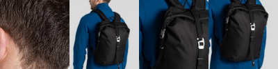 Rolltop back with multiple pockets and a 16 litre capacity. Recycled polyester 900D with EcoShield DWR finish. PU backing and recycled zip tape to all zips. Padded compartment fits tablet (up to 9") and laptop (up to 13").