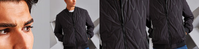 Tonal fashion coil zip on centre front with signature zip puller. Front & Back panels to be insulated with moulded vector shaped pattern. Insulated plain sleeves. 100gsm lightweight polyester fill. Fully-lined in tonal polyester. Bomber style collar. Welt pockets with rubberised stud opening, striped grosgrain trim with rectangular eyelet. Tonal elasticated cuffs and hem. Internal double jet zipped pocket. Internal zipped opening for embroidery access. Product contains no branded neck label.* Removable Kimble or looped garment tags. Inner seam label holds important product information on one label with a second label containing brand information which can be cut-away.
