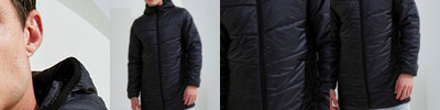 Lightweight mid-length padded jacket with diagonal quilting to centre front and back for a flattering fit. Vertical quilting side panels to body and horizontal quilting to arms. Full zip-through style with hood. Panel detailing to hood with elasticated finish for a snug fit. Internal storm flap. Zipped side pockets. Two concealed inner pockets, one left chest for storing items like a mobile phone or keys. Elasticated cuffs. Packable bag included for handy storage of jacket when not in use. We recommend using block out vinyl and inks.Product contains no branded neck or waist label. Removable Kimble or looped garment tags. Inner seam label holds important product information on one label with a second label containing brand information which can be cut-away.
