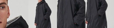 Water-resistant robe with sherpa fleece lining and a three-piece hood. Full double-ended zip down centre front. Zipped pockets with fleece lining. Inner zipped pocket with water-resistant lining. Inner embroidery access zip. Hook and loop fastening at wrist. Side vents.