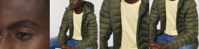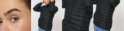 High collar with detachable hood, including metal matte hidden snaps. Hood opening and bottom hem with adjustable plastic stopper and elastic cord. Zipped welt pockets with extra grosgrain pull. Fully quilted. 1x1 rib at sleeve hem.