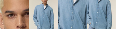 The Stanley denim shirt for men. Medium fit. Button-down collar with single-needle topstitches. Collar stand. Front placket single-needle topstitches on each side. Forwarded shoulder. Back yoke. Inside yoke in self-fabric. Set-in sleeves. Sleeve placket with one button. Cuff with two buttons. Rounded cuff corners. Double pleats at cuff seam. Faded look on all seams due to garment washing – indigo yarn dyed product – so each garment may vary in appearance.